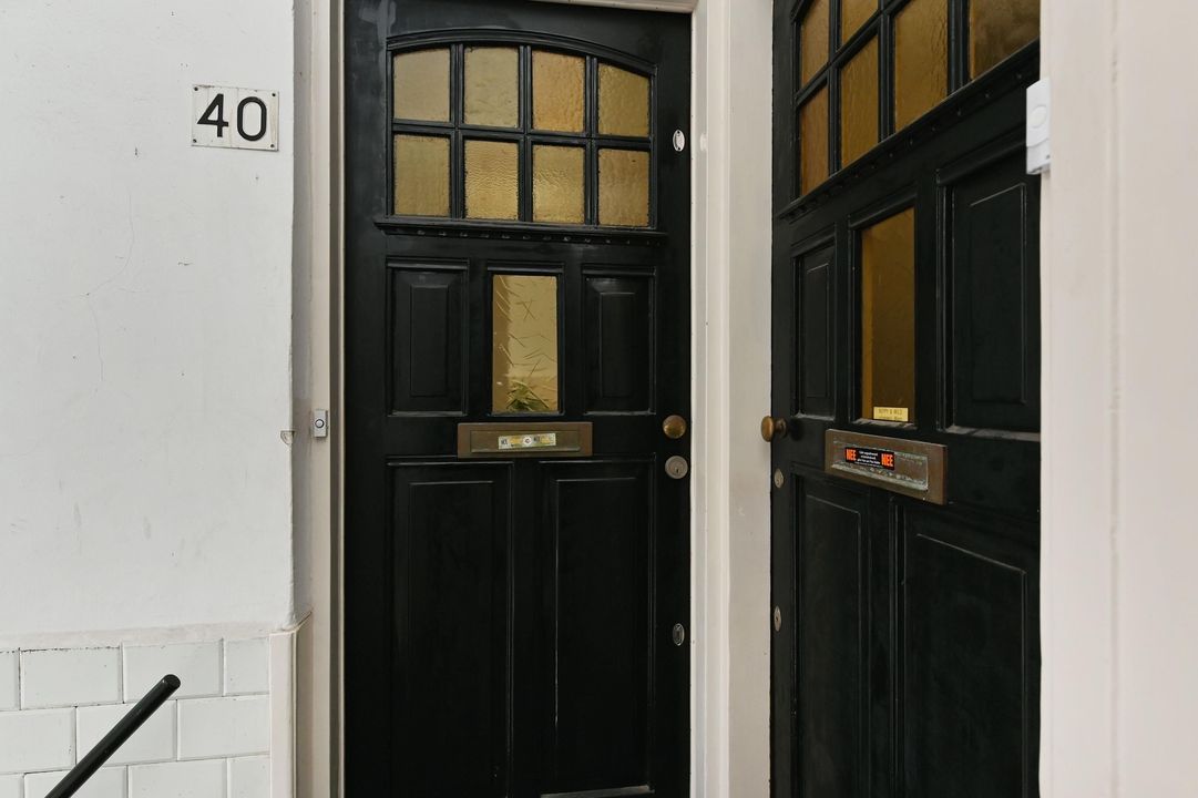 Private entrance at street level with stairs to the first floor. Spacious hallway providing access to all rooms. At the front you’ll find the bright living room with large windows and a charming view of the street. The modern kitchen is centrally located and equipped with various built-in appliances. There are two bedrooms, one with access to the southwest-facing balcony at the rear, and another generous bedroom located in the middle of the apartment. The neat bathroom includes a shower and washbasin. A separate toilet and practical built-in storage spaces are also available.