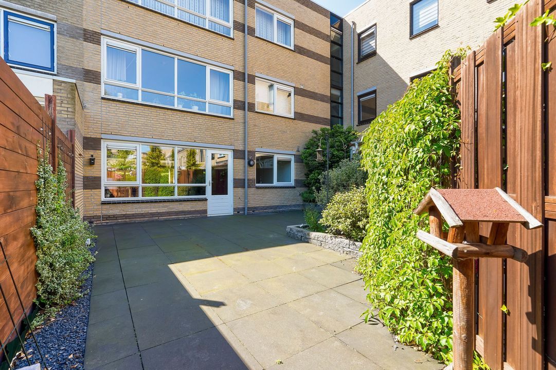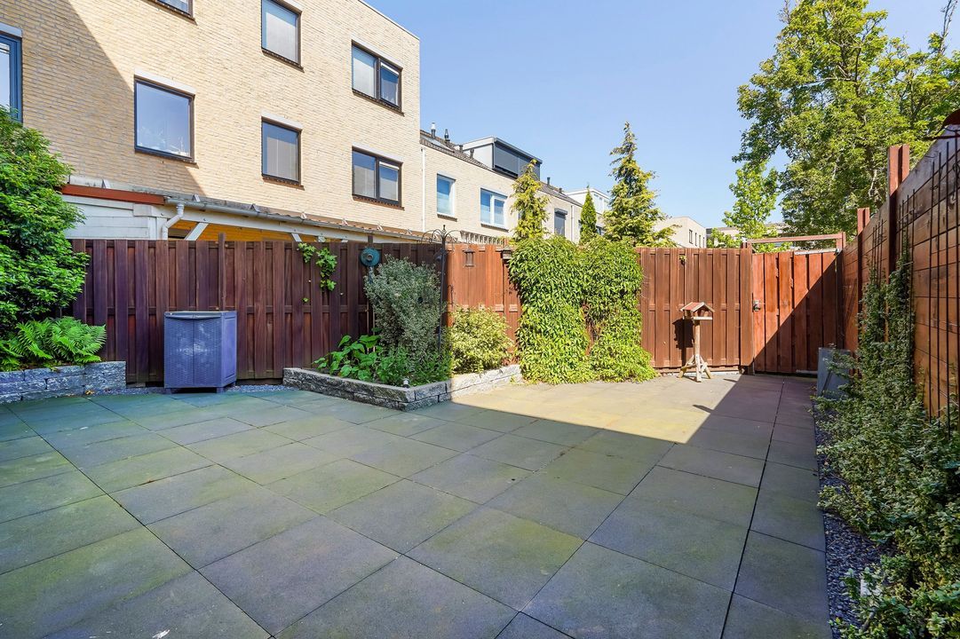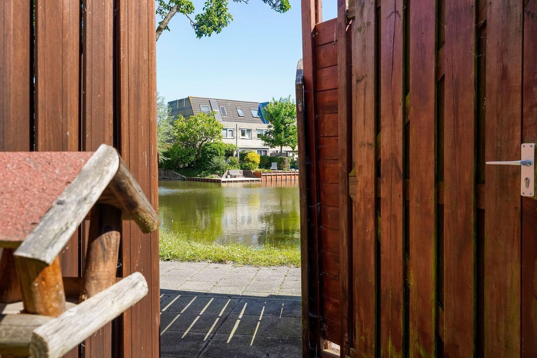 De zonnige voortuin op het zuiden is fraai aangelegd en beschikt over een terras, een ruime berging en een groen uitzicht op de boomkruinen. De voortuin meet circa 50 m² en het terras bijna 8 m², en is bereikbaar via een eigen afgesloten ingang. Aan de achterzijde bevindt zich een achtertuin van circa 32 m² met achterom, die toegang biedt tot de aangrenzende waterpartij. Tevens is er via de buitenzijde van het complex nog een extra afgesloten berging aanwezig.
