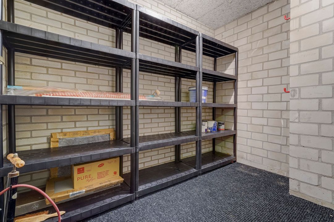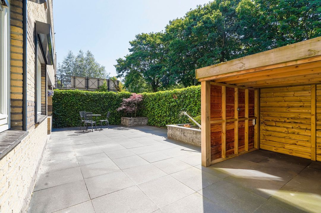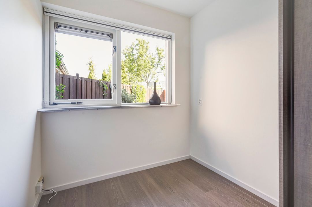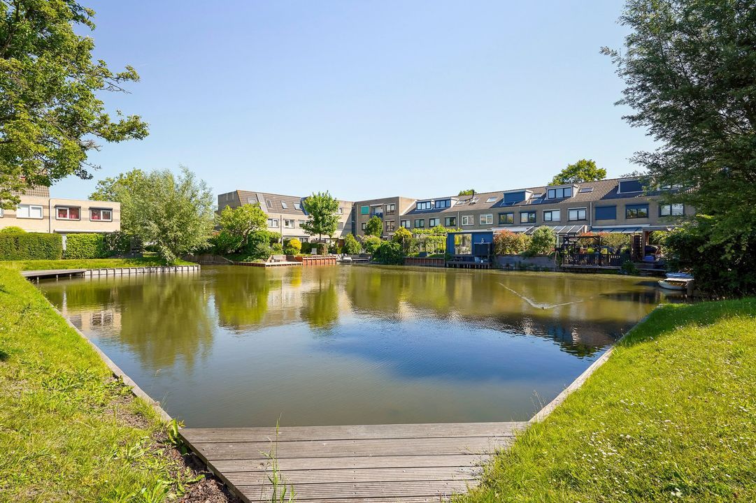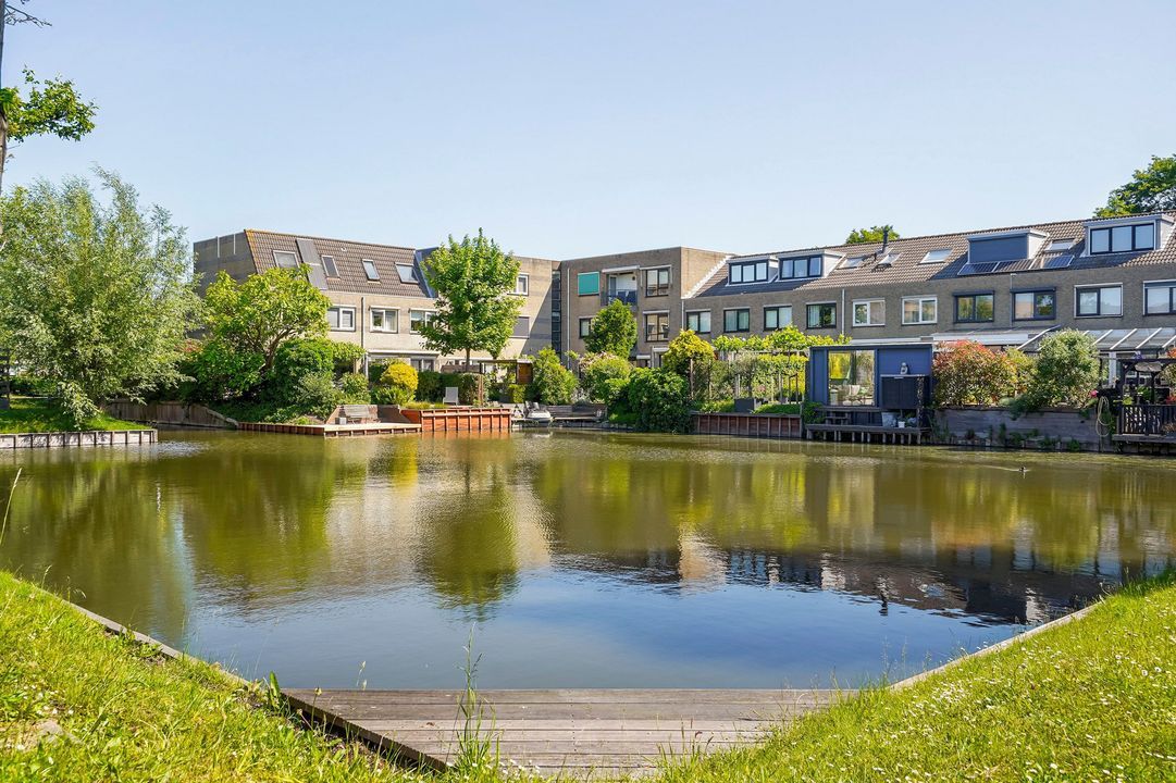 The sunny south-facing front garden is beautifully landscaped and features a terrace, a spacious storage shed and a green view of the surrounding treetops. The front garden covers approximately 50 m², with a terrace of nearly 8 m², and can be accessed via a private gated entrance. At the rear of the property there is a garden of approximately 32 m² with a back entrance, providing access to the adjacent water feature. Additionally, an extra private storage unit is available via the exterior of the complex.