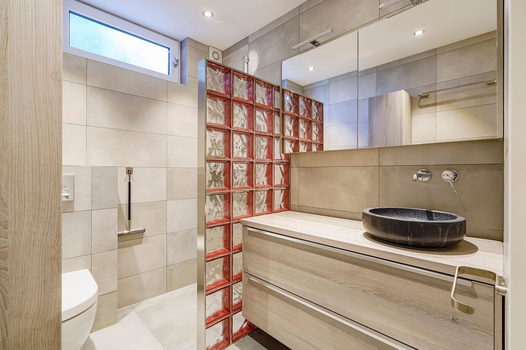 The secured main entrance of this small-scale apartment complex (8 apartments) is equipped with an intercom system. From here you reach the front door of the apartment. The hallway leads to the luxurious fully tiled bathroom on the left, featuring a walk-in shower, vanity unit and toilet. In addition, there is a separate toilet with washbasin and a practical storage cupboard housing the fuse box.